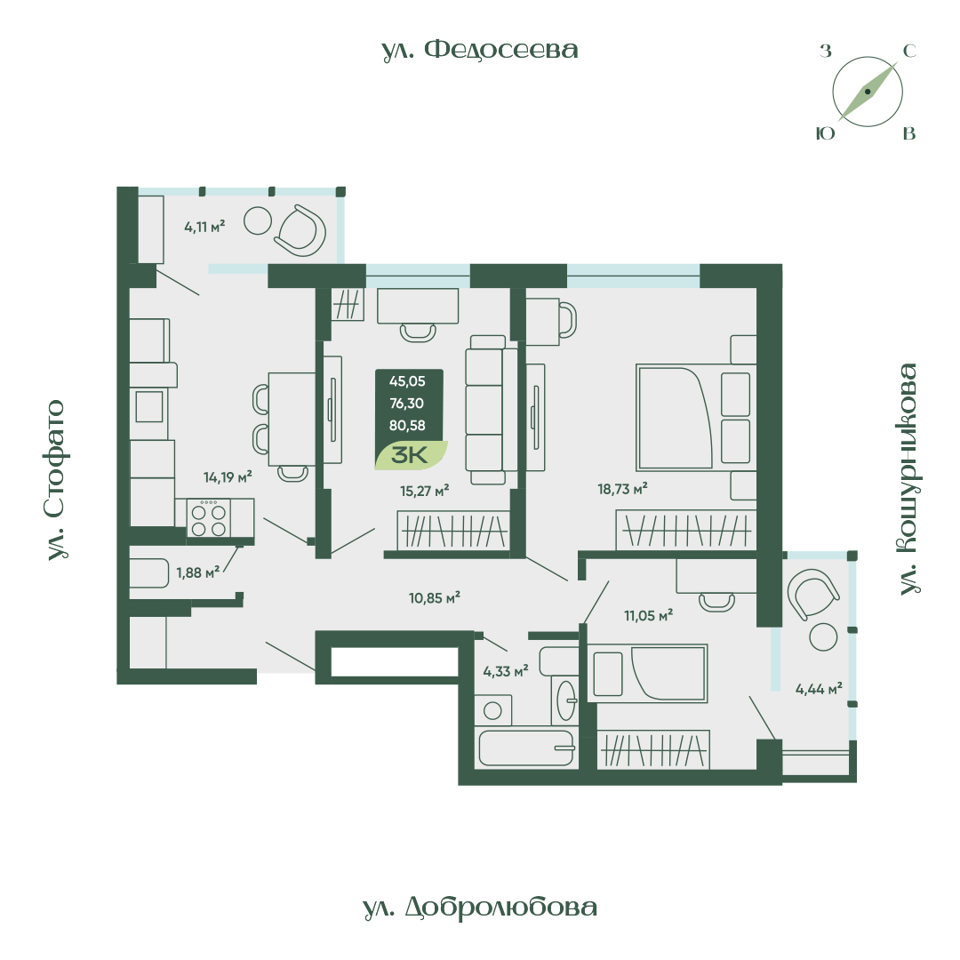 В разнообразии планировочных решений есть оптимальное для вашего жизненного сценария – индивидуального или семейного: от уютных 1-комнатных студий до просторных 3-комнатных квартир с двумя санузлами.