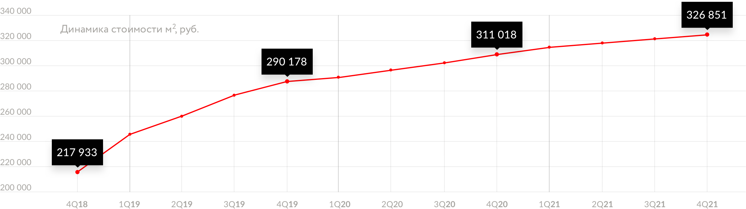 Наибольший рост стоимости показывают апартаменты, приобретённые начальном этапе строительства или на закрытых продажах по специальным условиям, когда цена минимальна. Но, например, при покупке апартамента в мае 2022 года его стоимость будет расти вплоть до окончания строительства.